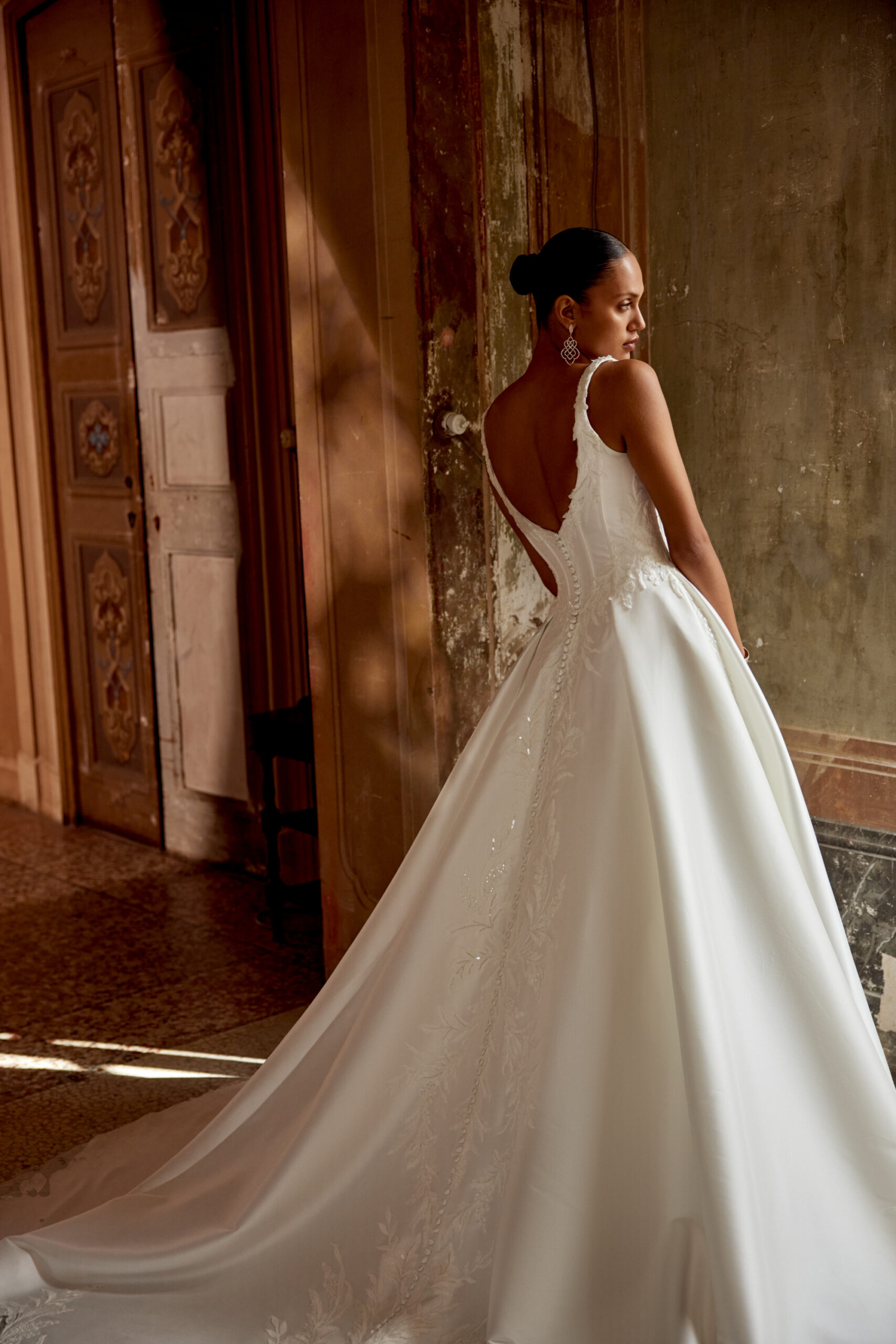 Idonia by Justin Alexander is a Mikado A-line gown with plunging V-neckline and illusion back.